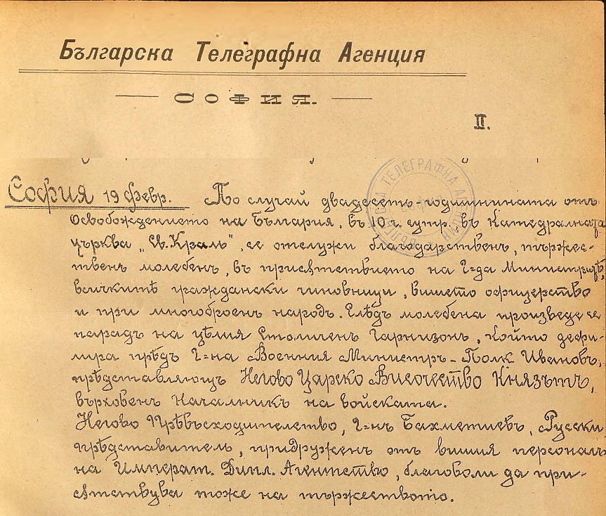 Още в първите бюлетини, които новосъздадената Българска телеграфна агенция издава, четем за тържественото честване на двадесетгодишнината от Освобождението на България.