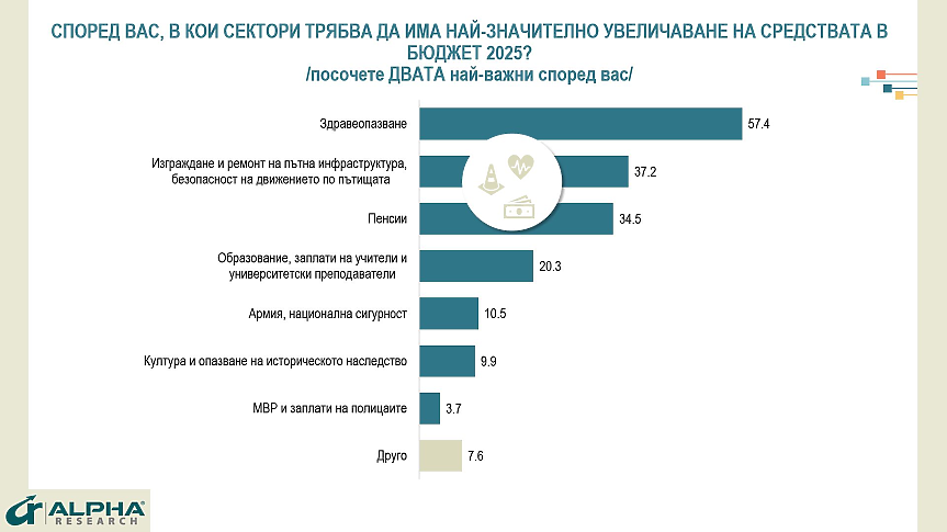 Според абсолютното мнозинство от българите, 57%, най-значително увеличение на средствата в Бюджет 2025 трябва да има за здравеопазване. Здравеопазването е приоритет за абсолютно всички социални, демографски и електорални групи, като единствено при хората над 65г. е изместено от желанието за ръст на пенсиите.