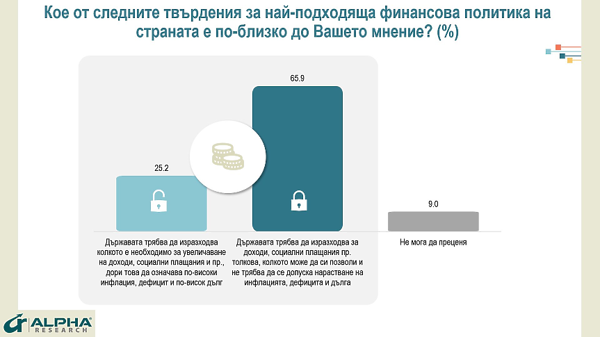 „Държавата трябва да изразходва за доходи, социални плащания пр. толкова, колкото може да си позволи и не трябва да се допуска нарастване на инфлацията, дефицита и дълга“ – смятат 66% от запитаните. На противоположната позиция, „държавата трябва да изразходва колкото е необходимо за увеличаване на доходи, социални плащания и пр., дори това да означава по-високи инфлация, дефицит и дълг“ са 25% от анкетираните. 9 на сто не могат да преценят коя финансова политика е по-подходяща за страната.