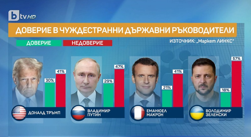 В България президентите на САЩ и Русия Доналд Тръмп и Владимир Путин имат по-високо доверие от лидерите на Франция и Украйна Еманюел Макрон и Володимир Зеленски. Това показва проучване на "Маркет линкс", направено по поръчка на бТВ. То е проведено сред 1025 лица над 18-годишна възраст.