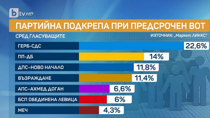 Ако изборите бяха днес ГЕРБ щеше да има 22,6%. "Продължаваме промяната - Демократична България" остава втора сила с 14%/. След това се нареждат ДПС - Ново начало - 11,8% "Възраждане" - 11,4%, ДПС-ДПС - 6,6%, БСП - 6% МЕЧ - 4,3%