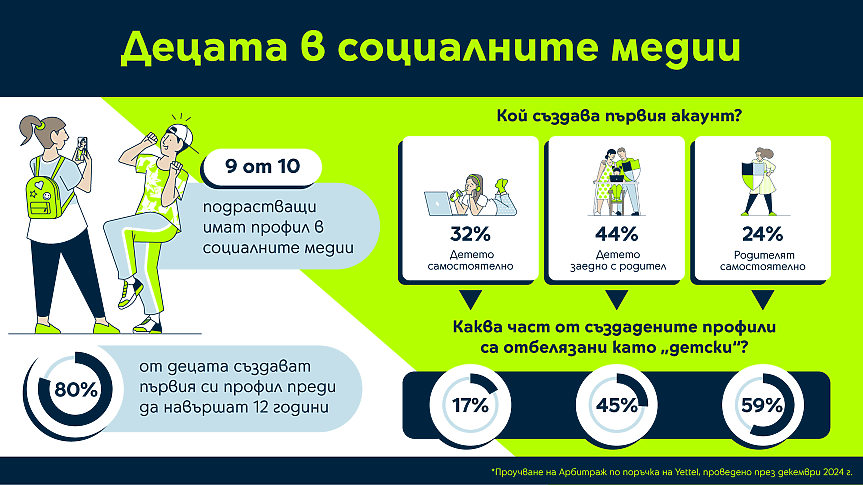Децата стават активни потребители на интернет и социалните медии все по-рано, показва новото проучване на Yettel „Дигиталният живот на децата и техните родители“. Данните сочат, че 9 от 10 подрастващи (до 19 години) имат профил в социалните медии, като 75% го създават преди да навършат 12 години, а 5% - под 7-годишна възраст. Ежегодното допитване на телекома е проведено от агенция за пазарни проучвания „Арбитраж“ в края на 2024 г. сред деца (7-12 г.), тийнейджъри (13-19 г.) и техните родители. То показва тенденциите при потреблението на интернет сред подрастващите, най-честите заплахи и опасности, срещу които се изправят, и какъв контрол осъществяват родителите, за да ги защитят.
