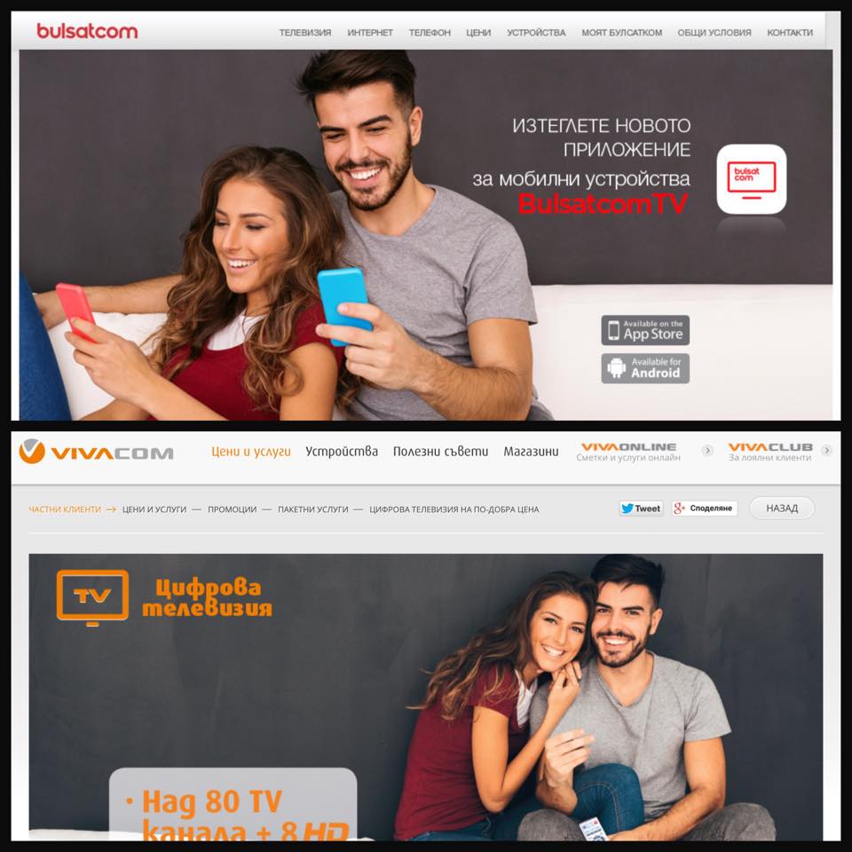 Долепени една до друга двете картинки по-скоро изглеждат като различни визии на една и съща компания. Още повече, че усмихнатите млади хора, рекламиращи услугата са в абсолютно еднакви дрешки.