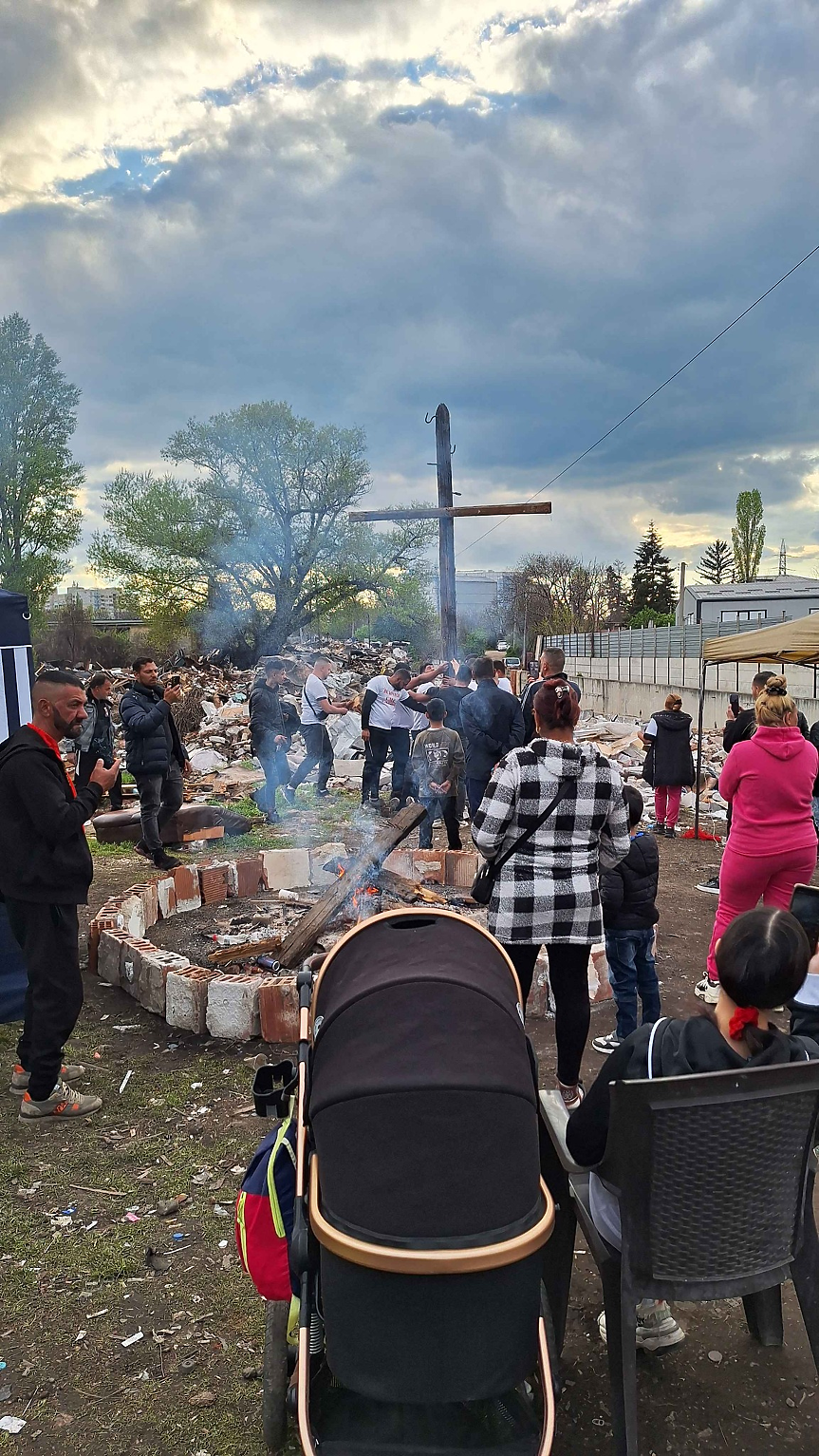 Докато говорим, над разрушеното гето се появява дъга, огряна от последните лъчи на слънцето преди Великден. Разговорите около огъня край кръста постепенно се оживяват, хората макар и за малко сякаш забравят положението си, нали е празник. Благодаря и им казвам, че трябва да тръгвам, а те: