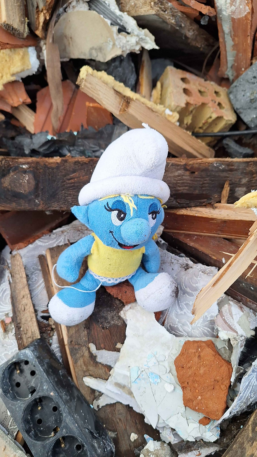 Вървим по развалините и виждам остатъците от погребани вещи, свидетелства за погребани животи. Ако човек се вгледа сред тухлите и мазилката се открива счупена прахосмукачка, паста за зъби, част от видеокамера, детски играчки и какво ли още не. Повечето детски играчки са изцапани от праха от сградите, но забелязвам един съвсем чист плюшен смърф, който стои сред парчета тухли. Чудя се дали онази сутрин е бил в нечие детски легло и е бил изоставен още топъл от детската прегръдка, когато хората е трябвало бързо да напуснат жилищата си.