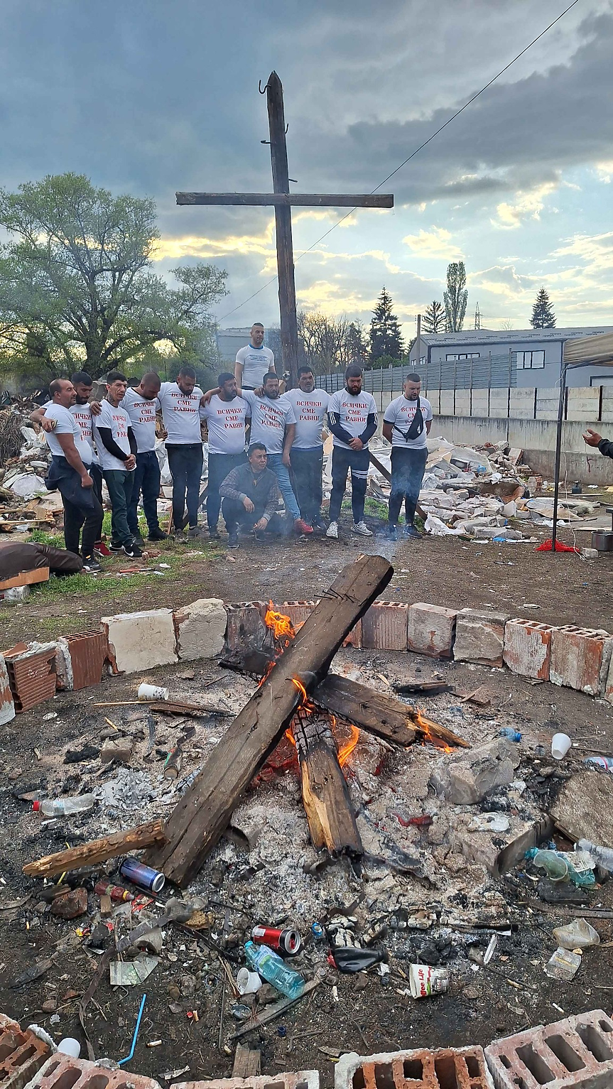 Оказва се, че не е толкова лесно да се фиксират двете големи греди една за друга само с пирони и Марин, неформалният лидер, дава наставления да се добавят и малки летвички - дървен материал има в изобилие от съборените къщи и младежите сръчно изпълняват задачата. Най-после кръстът е готов. Марин разпорежда няколко човека да облекат протестните тениски на чието лице пише ВСИЧКИ СМЕ РАВНИ, а на гърбовете НЕ СЪМ РАСИСТ. Мъжете подхващат кръста и го поставят в предварително изкопана за него дупка. Хората се събират около кръста и пастор изрича кратка молитва, в която моли Исус да види тези хора и им даде по-добро бъдеще, в което всяко семейство да има собствена земя и собствено жилище.
