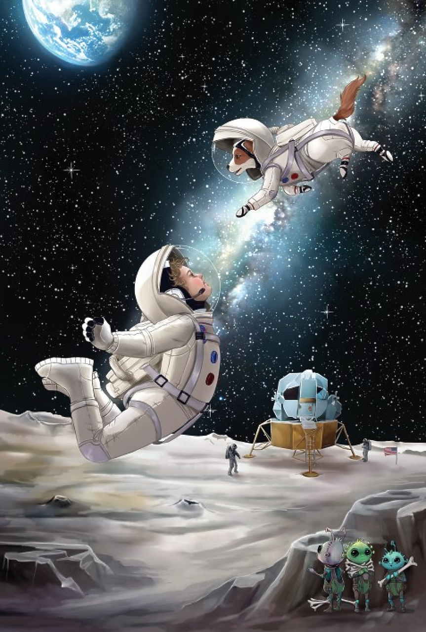 На борда на „Аполо 11“ двамата ще пътуват редом със смелия Нийл Армстронг, ще докоснат Луната и ще направят голям скок за човечеството (и кучеството). Ала дали това далечно място без никакви кокали е подходящо за тях?
