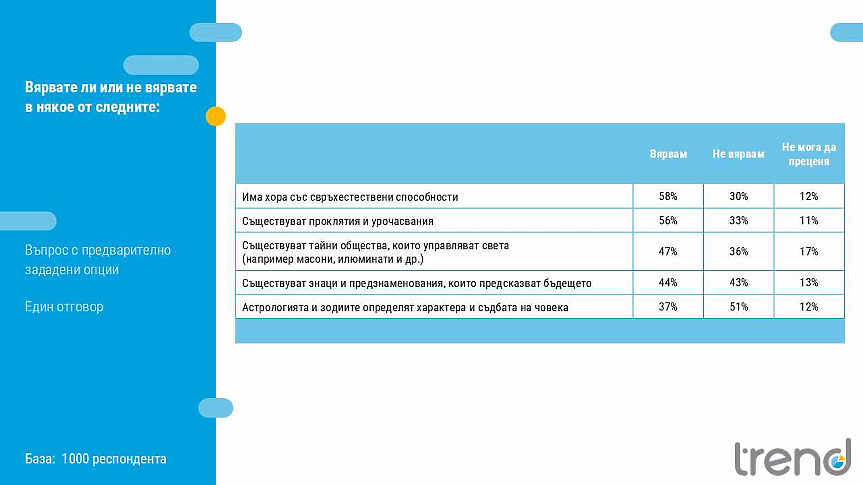 Вярата в свръхестественото и конспиративното остава важна част от българската културна картина, показва ново национално представително проучване на агенция „Тренд“, проведено по поръчка на „24 часа“ през октомври 2025 г.