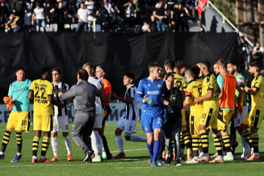 Пловдивското футболно дерби между отборите на Локомотив и Ботев бе прекратено, след като в 40-ата минута на мача вратарят на "канарчетата" Даниел Наумов бе уцелен с бутилка в главата от привържениците на "черно-белите", разположение на трибуна "Бесика".