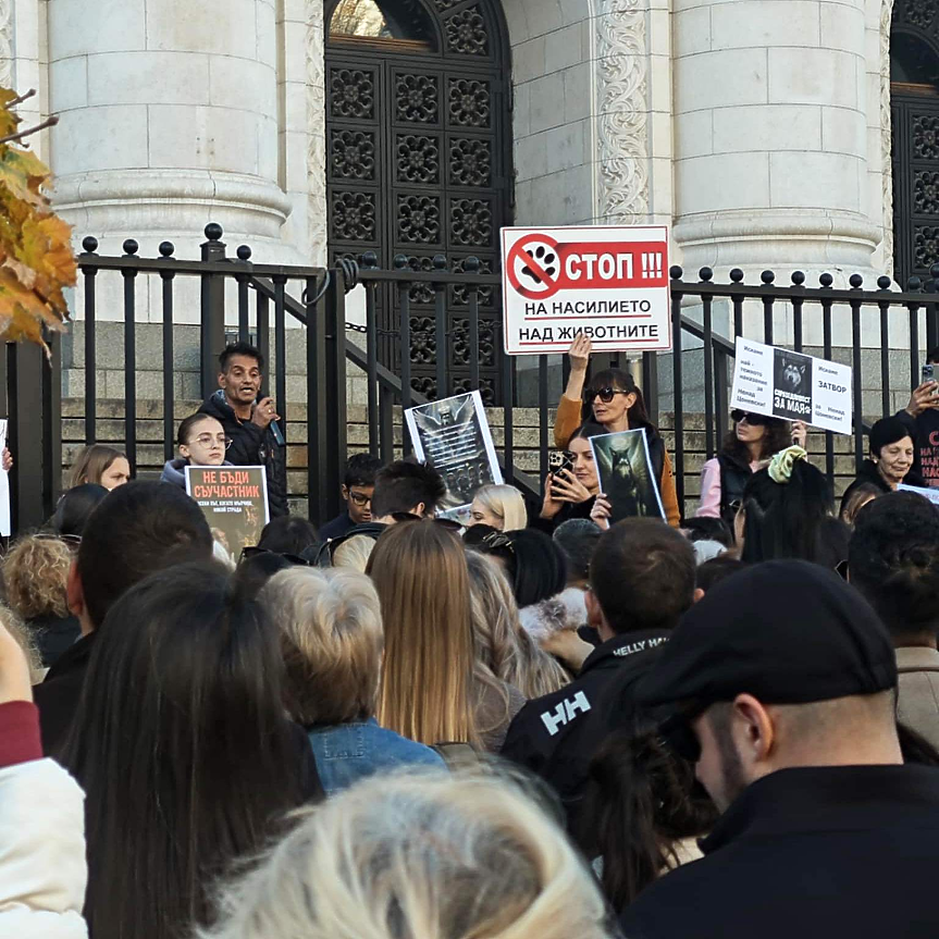 Около 1000 души се събраха този следобед пред Съдебната палата в София в протест срещу насилието над животни. Демонстрацията бе провокирана от нашумелия случай с прегазеното куче Мая, както и от шокиращите разкрития за търговия с видеа на измъчвани животни, снимани в Перник.