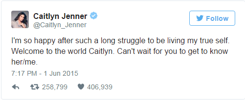"Толкова съм щастлива след дълга борба вече да живея в собственото си "Аз" Добре дощла на света, Кейтлин. Нямам търпение тя да ме опознае". С това съобщение Дженър оповести промяната в себе си.