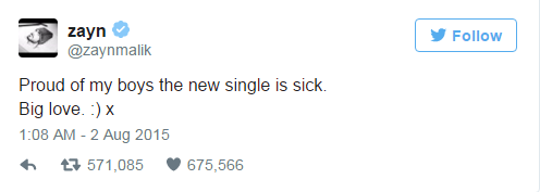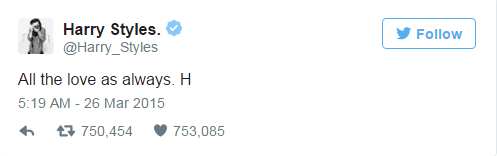 Ако сте се притеснили, че един от членовете на момчешката група не е представен с туитовете си, вече може да сте спокойни. Съобщението на Хари Стайлс в ключов момент се оказва най-споделяния туит през 2015 г. Посланието гласи: "Цялата любов, както винаги. Х." Мда, страшна работа.