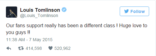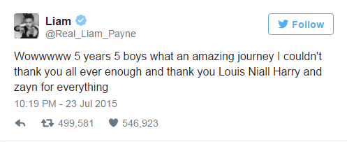 "Уау, 5 години 5 момчета, какво забележително пътуване. Не мога да благодаря достатъчно на всички ви, благодаря Луи, Найл, Хари и Зейн за всичко".