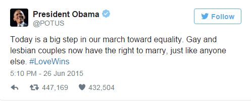 "Днес беше направена голяма стпъка в нашия поход към равенство. Еднополовите двойки вече имат правото да сключват брак, точно както всички останали", написа Обама. Съобщението завършва с хаштага "любовта печели".