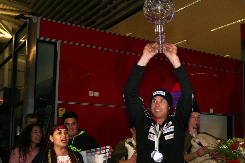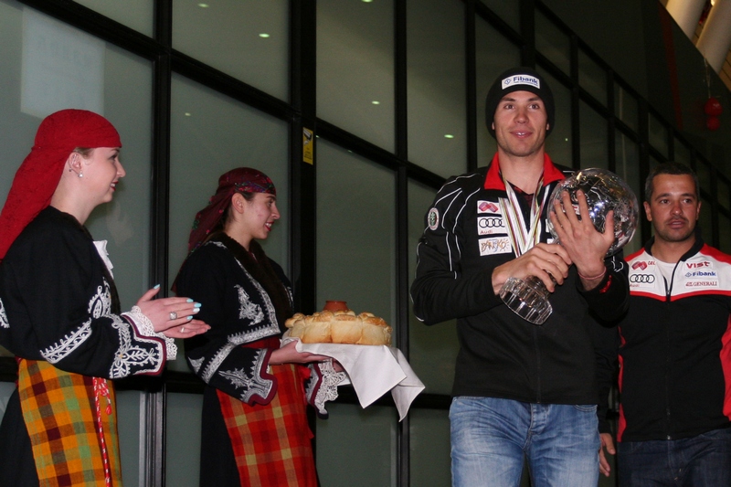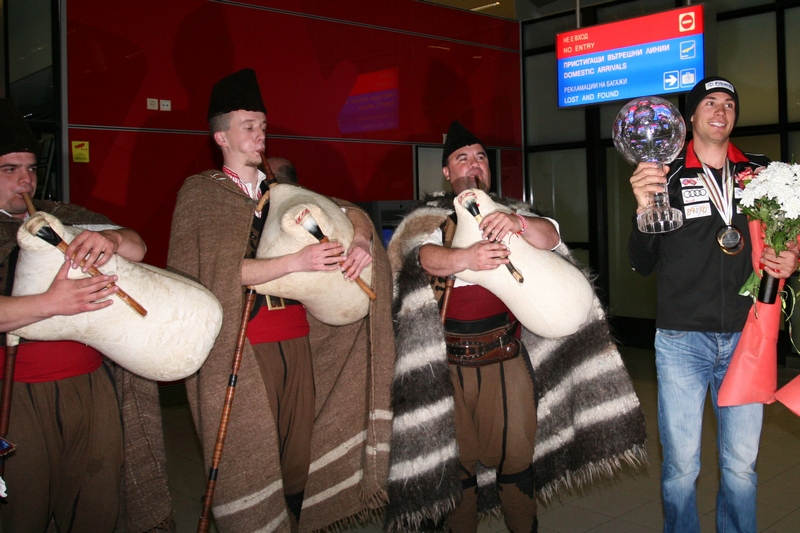 Носителят на Световната купа в паралелните дисциплини на сноуборда Радослав Янков бе посрещнат снощи на летище "София" с гайдари, момичета с народни носии, хляб и сол, песни... Радо е от Чепеларе и съгражданите му го изненадаха с цяла програма.