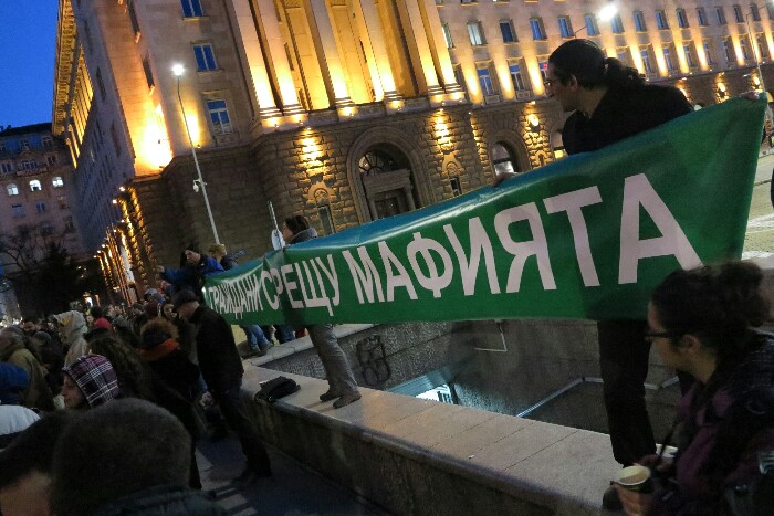 Протестиращи с плакат "Граждани срещу мафията" застанаха на първа линия на протеста - на ръба на фонтана пред "Дондуков" 2.