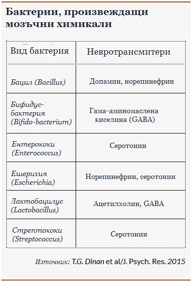 Според изследователите микробите в организма могат да променят начина, по който работи мозъка, защото произвеждат същите химикали, които мозъчните клетки използват за комуникация (т. нар. трансмитери). Една от теориите е, че подходящите бактерии биха могли не само да подобряват общото състояние на духа ни, но и дори да се борят с тежки психични разстройства, като депресията.