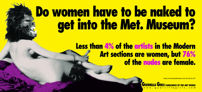 Още през 1989 г. групата Guerrilla Girls показа, че 76% от картините с голи тела в музея „Метрополитън“ изобразяват жени, но едва 4% са създадени от представителки на нежния пол и зададе въпроса: „Трябва ли една жена да бъде гола, за да влезе в „Метрополитън?” В последвалата бурна дискусия се разкри, че нашата култура не просто е забравила жените. Тя постоянно и умишлено ги е изтривала от записите и документите.