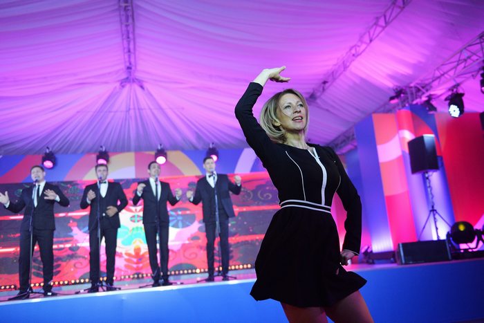 Захарова предварително обещала да изтанцува "Калинка". И изпълнила обещанието си по време на приема, даден на журналисти.