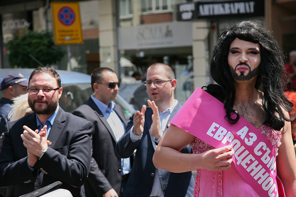 Облечен като Кончита Вурст атакист протестираше срещу хомосексуализма и травестизма, според надписа на лентата му - "европейски ценности"
