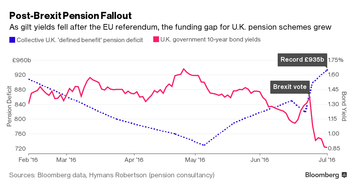 Общият дефицит на фондовете за фиксирани пенсии - обикновено финансирани от работодателите, които обещават конкретна месечна сума след пенсионирането – се покачи от 820 на 900 милиарда паунда още на следващия ден след референдума, показват данни на консултантската компания Hymans Robertson. В следващите седмици дефицитът нарасна до 935 милиарда паунда.