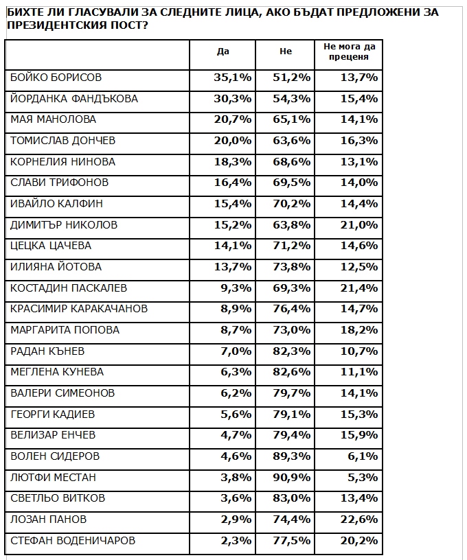 Изследването обаче не е тествало номинацията на патриотичните сили за президентска двойка - лидерът на ВМРО Красимир Каракачанов с вице Явор Нотев от "Атака". Тя бе обявена днес. В анкетите не присъства и номинация на бившия президент и лидер на АБВ Георги Първанов.