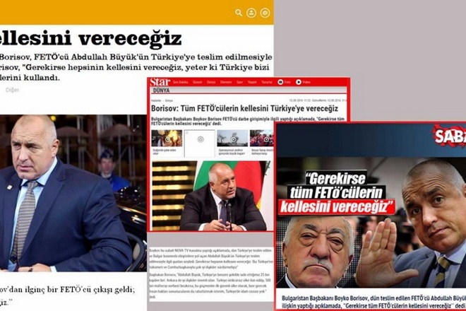 В същото време турските медии широко отразиха интервюто на премиера Бойко Борисов пред Нова тв като поставиха акцента върху изявлението, че „ако трябва, ще вземе главите на всички хора на Гюлен". Точно тези думи са използвани от проправителствените издания и телевизии в Турция.