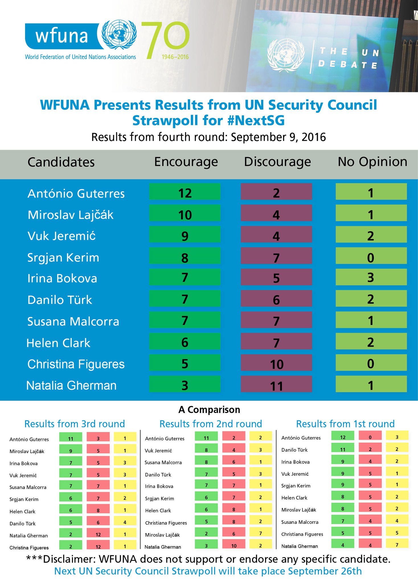 След първите две гласувания в Съвета за сигурност на първо място за избор на нов генерален секретар бе Антонио Гутереш. До 2015 година той бе Върховен комисар на ООН за бежанците. Въпреки че много се говори в публичното пространство, че наследник на Бан Ки Мун вероятно ще е жена, и вторият след Гутереш беше мъж - бившият словенски президент Данило Тюрк се класира при първия кръг от гласуването, а на втория застана бившият външен министър на Сърбия Вук Йеремич. Сега преднина е набрал Лайчак. Ирина Бокова бе на трето и пето място на първите два тура.
