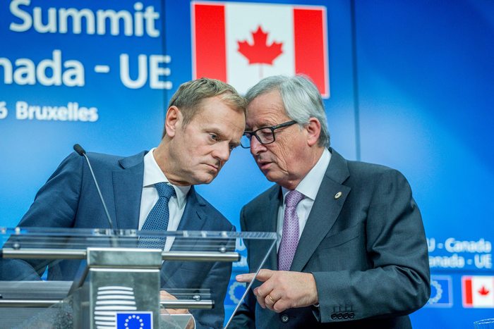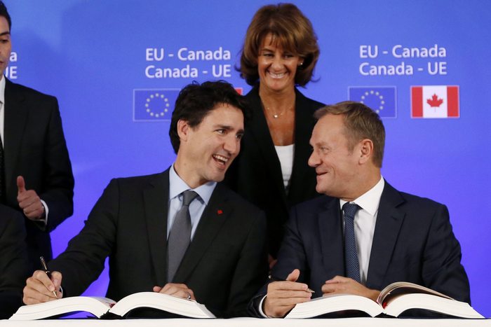 Под споразумението, което партньорите се надяват да прибави 12 милиарда евро годишно към техния БВП, подписи сложиха канадският министър-председател Джъстин Трюдо, Юнкер, председателят на Европейския съвет Доналд Туск и Роберт Фицо, министър-председател на Словакия, която в момента държи ротационното председателство на ЕС.