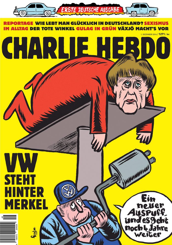 Отделно "Шарли ебдо" рекламира първия си брой за Германия със стикер, на който Меркел е нарисувана, седнала върху тоалетна чиния. В тази поза тя чете списанието, на чиято корица е нарисувана самата тя.