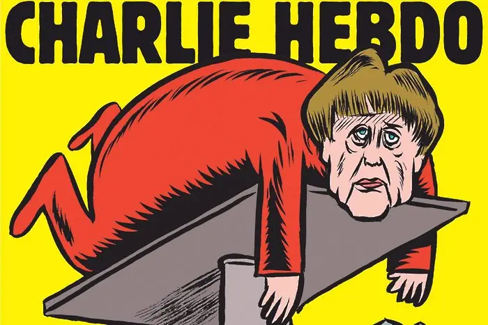 Сатиричното списание "Шарли ебдо" пусна карикатура на Ангела Меркел в първия си брой на немски език.