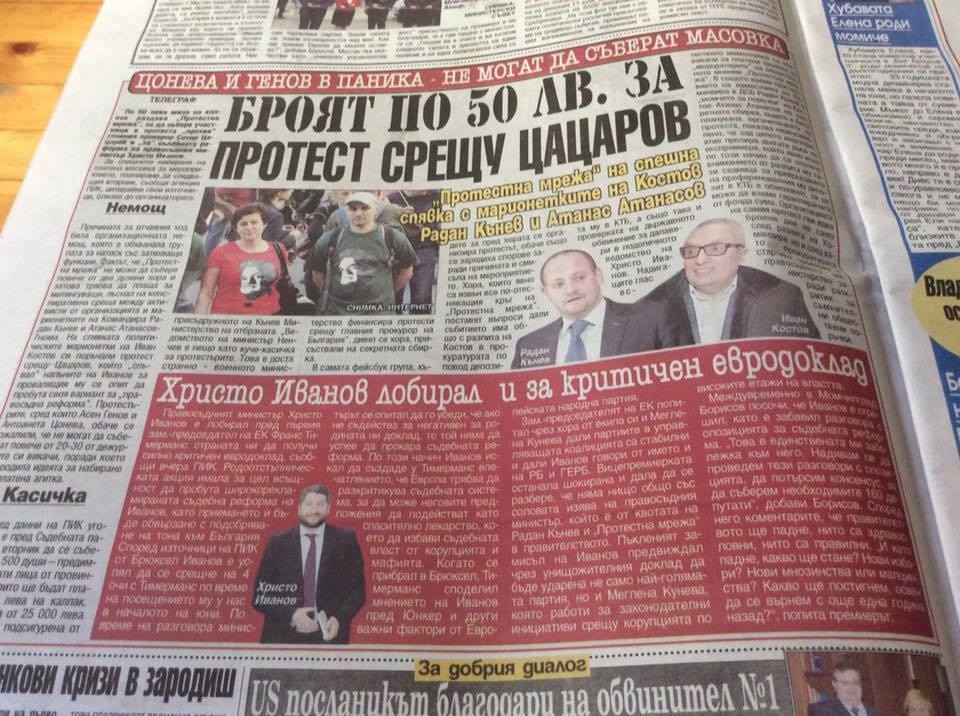 Същите твърдения за „платени протести“ срещу главния прокурор Сотир Цацаров са били публикувани в притежавания също от Пеевски вестник „Телеграф“, както и в гравитиращото около него по това време онлайн издание „Пик. Един и същи текст е публикуван с различни заглавия.