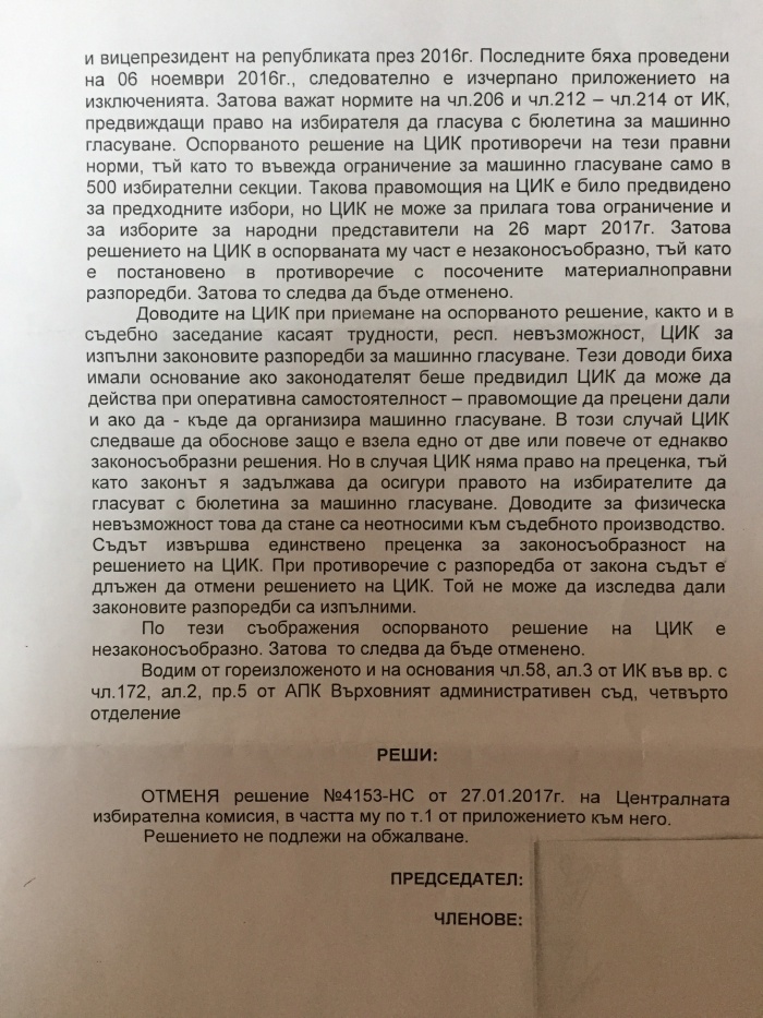 Решението на Централната избирателна комисия, според което машинното гласуване на предсрочните избори на 26 март се провежда само в 500 секции, е в нарушение на закона. Това реши Върховният административен съд след жалба на Петър Славов, Мартин Димитров, Трайчо Трайков и Радан Кънев от "Нова република".