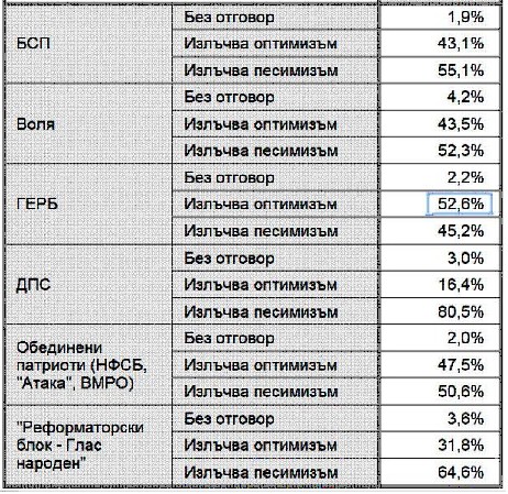 ГЕРБ имаше две правителства след 2009 г. и доста критици както отляво, така и отдясно. Ако някой каже, че критиките са били неоснователни, означава да излъже. При ГЕРБ обаче няма колебания относно посоката на развитие на страната. Партията на г-н Борисов е най-еврооптимистичната в България и е единствената от големите български партии, която ясно защитава европейското бъдеще на страната. Нещо повече, в момента ГЕРБ е единствената оптимистична партия сред шестте формации с най-висока електорална подкрепа. По данни на “Алфа Рисърч” на въпроса дали дадена формация излъчва оптимизъм или песимизъм единствено при ГЕРБ има положителни показатели.