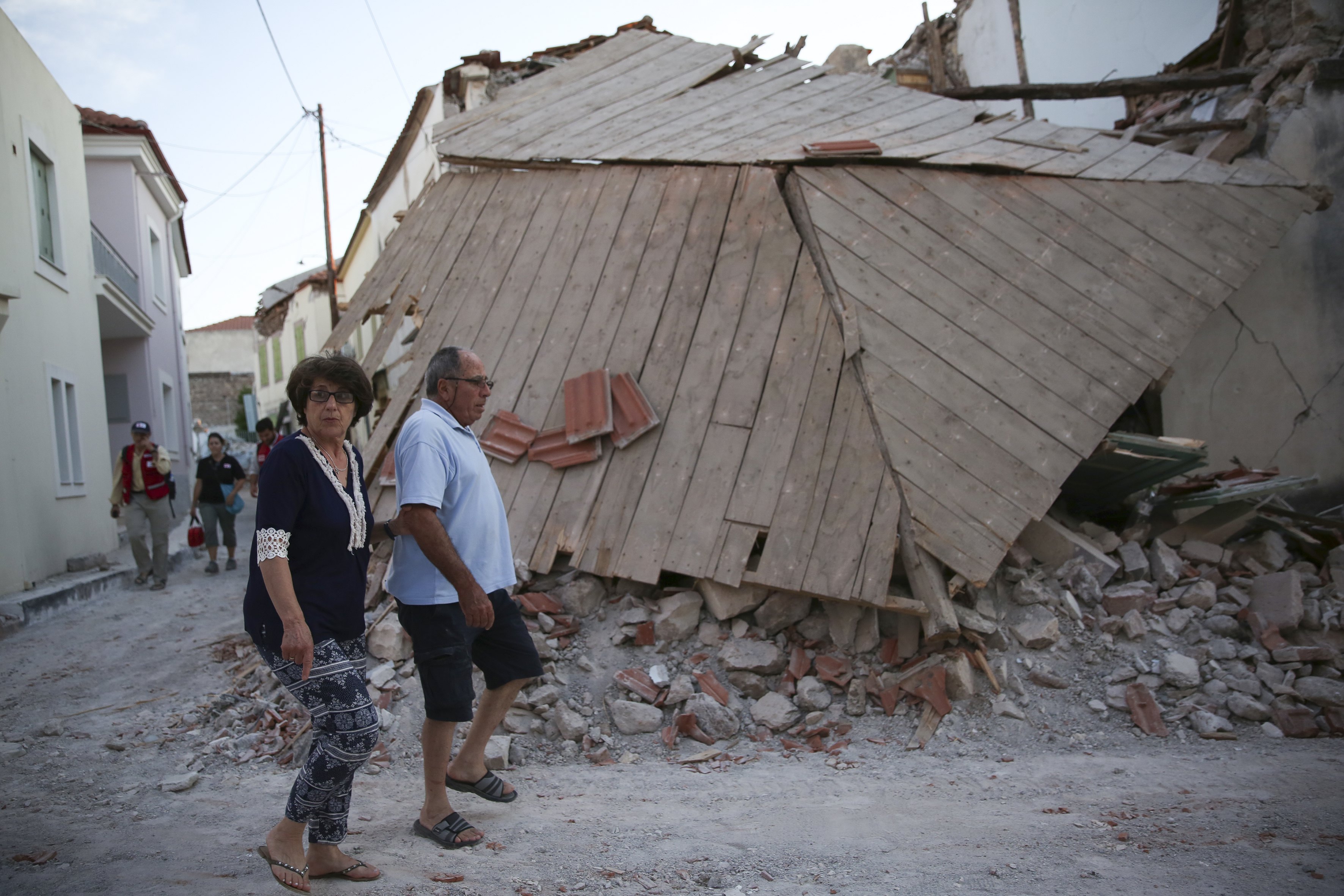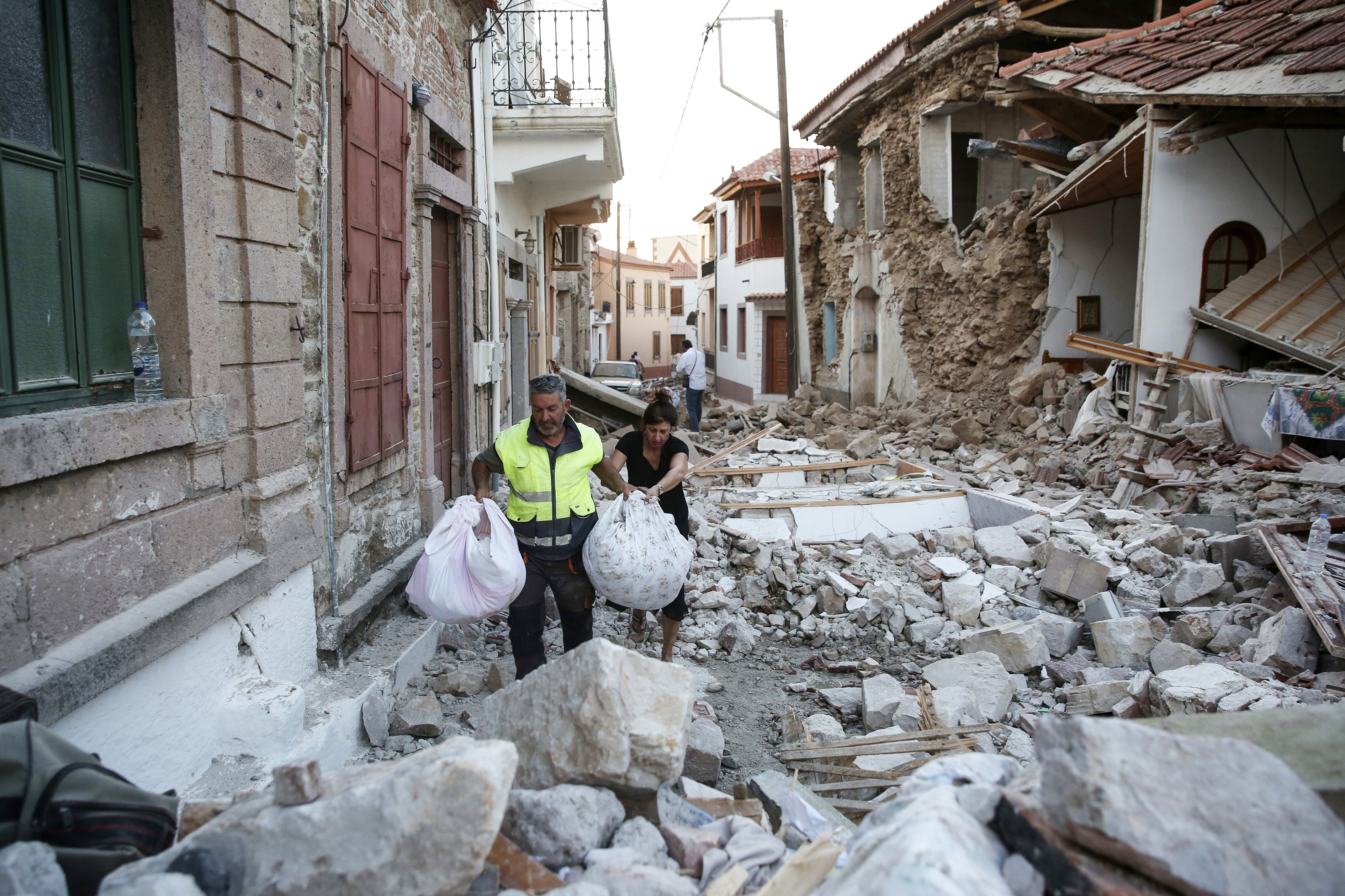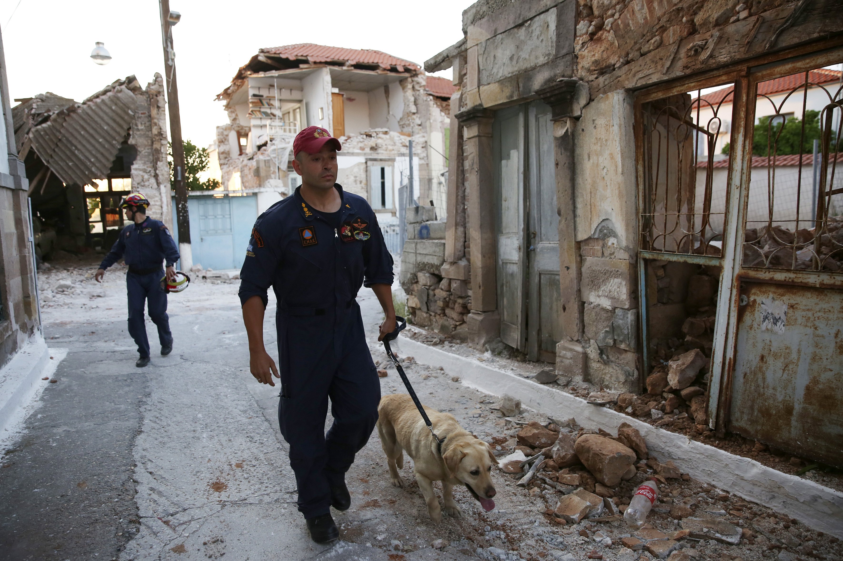 Спасителни екипи обхождат засегнатите от труса сгради в село Вриса, Лесбос. Снимка БГНЕС