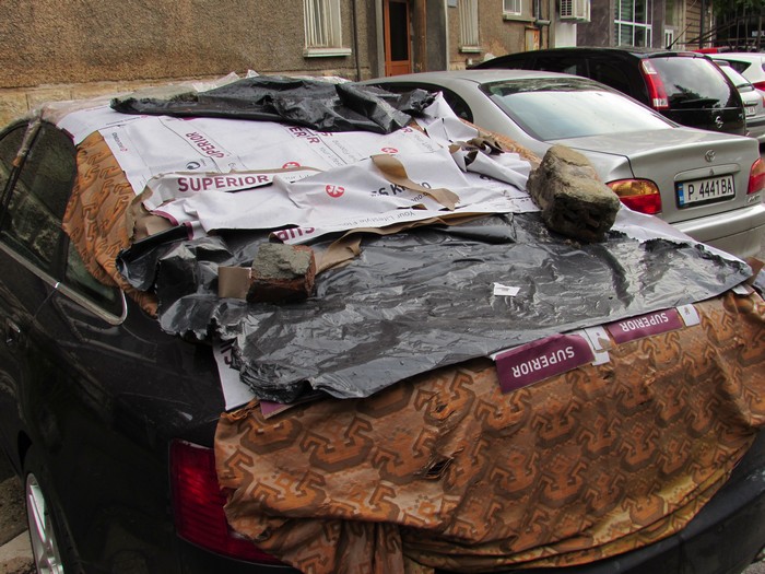 Като реакция срещу градушката много българи покриха колите си с импровизирана защита, като този шофьор в Русе, защитил автомобила си с няколко слоя различни материали.