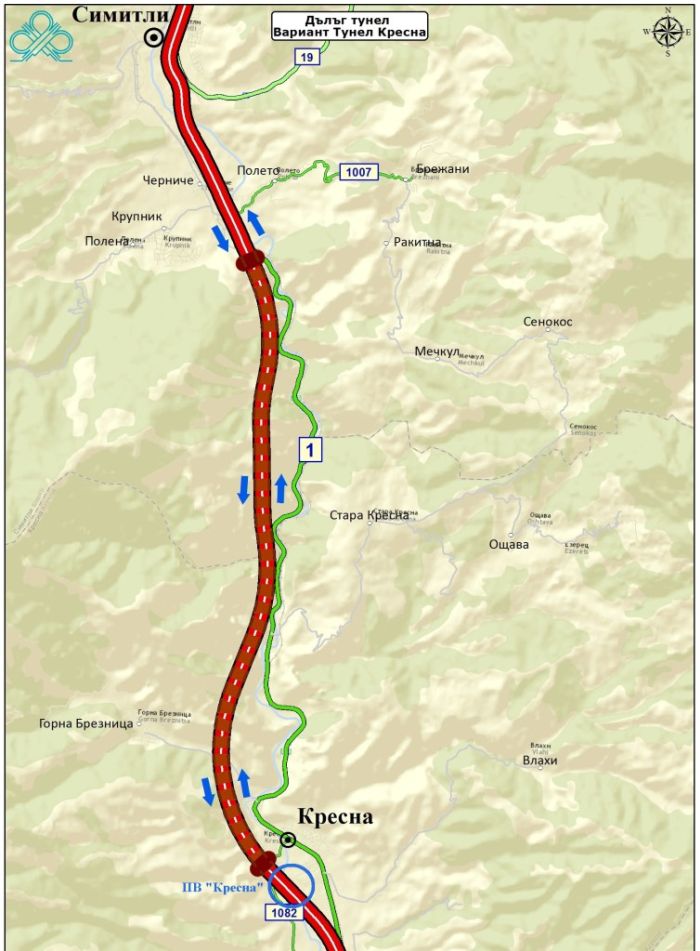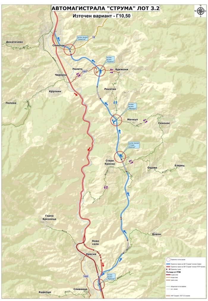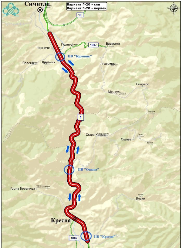 Предвидено е изграждането на общо 3 пътни възела - при Крупник, Ощава и Кресна. При този вариант трябва да се изградят 13 виадукта с обща дължина, 23 тунела, 5 моста и др.