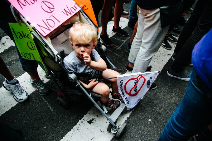 Докато президентът говореше от Тръмп Тауър, отвън се събраха неколкостотин демонстранти против расизма.