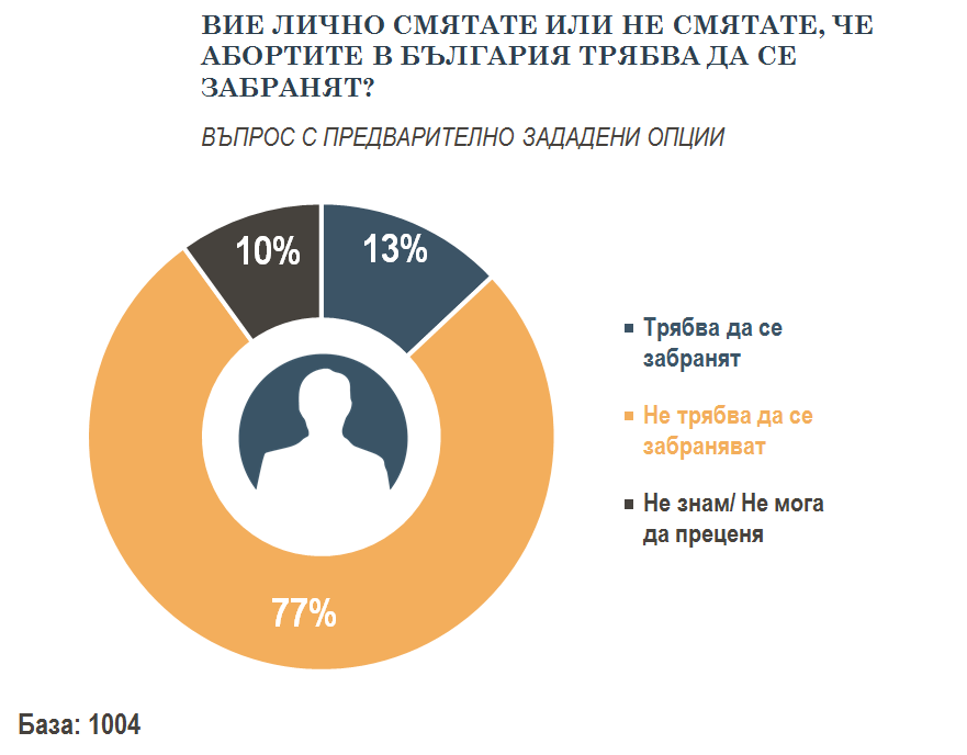 Колкото и патриархално да изглежда настроен и да се изявява като защитник на семейните ценнности, когато става дума за абортите, българинът демонстрира либерално отношение. 77 на сто от анкетираните смятат, че абортите не трябва да се забраняват.