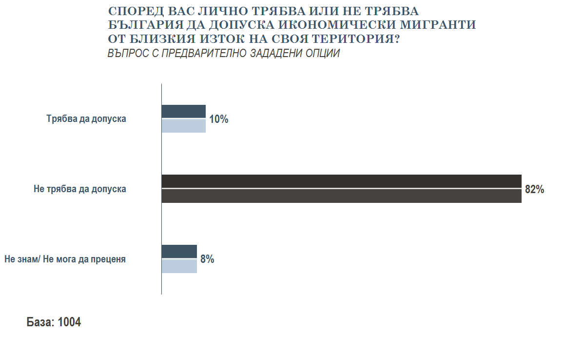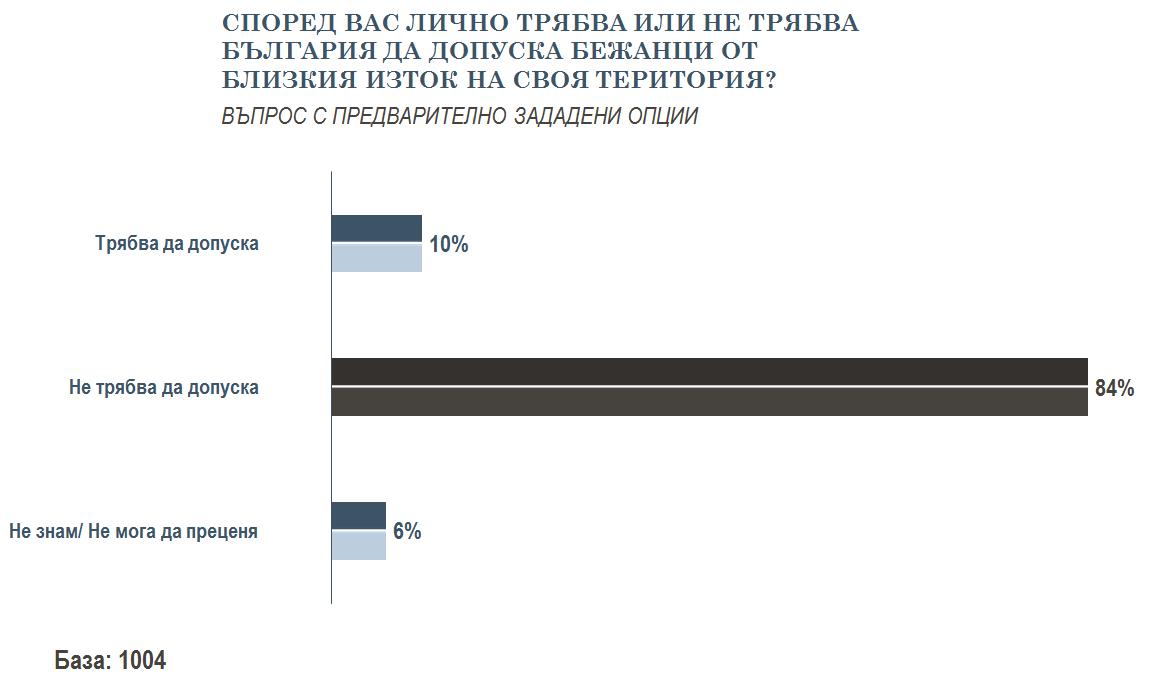 Бежанци или икономически мигранти - няма никакво значение. Българите не ги желаят, а вероятно и не правят разлика между двете категории. 84 на сто от участниците в изследване на агенция "Тренд" смятат, че бежанците от Близкия изток не бива да бъдат допускани на територията на страната. Почти същият процент - 82 на сто, са на това мнение за икономическите мигранти.