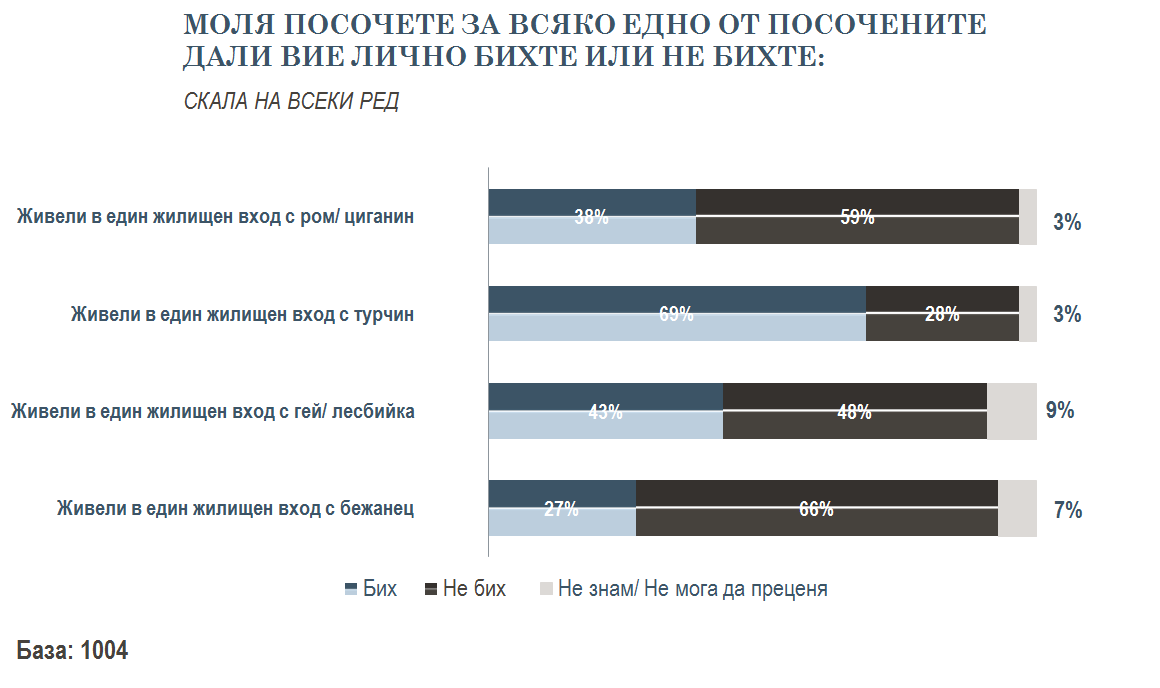 Отново най-неприемливо се оказва съседството с бежанец - две трети от анкетираните казват, че не са съгласни да живеят в един вход в бежанец (това обяснява и множеството протести в малки населени места и опитите за прогонване на бежански семейства - б.р.).