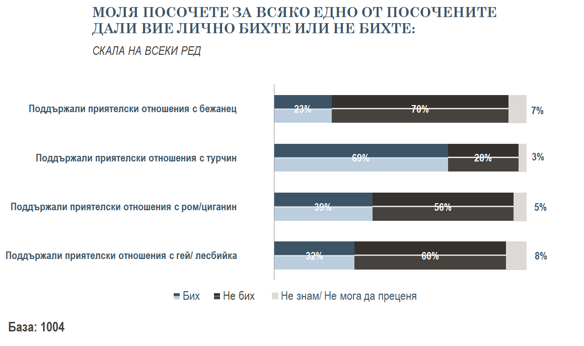 Изследването потвърждава тенденция, регистрирана и по-рано - още с появата на бежанската вълна, че бежанците/мигрантите се приемат като най-голямата опасност и събуждат най-негативни чувства. Едва 23 на сто от анкетираните заявяват, че са готови да поддържат приятелски отношения с бежанец. Много повече са тези, които са готови на близки отношения с ром.