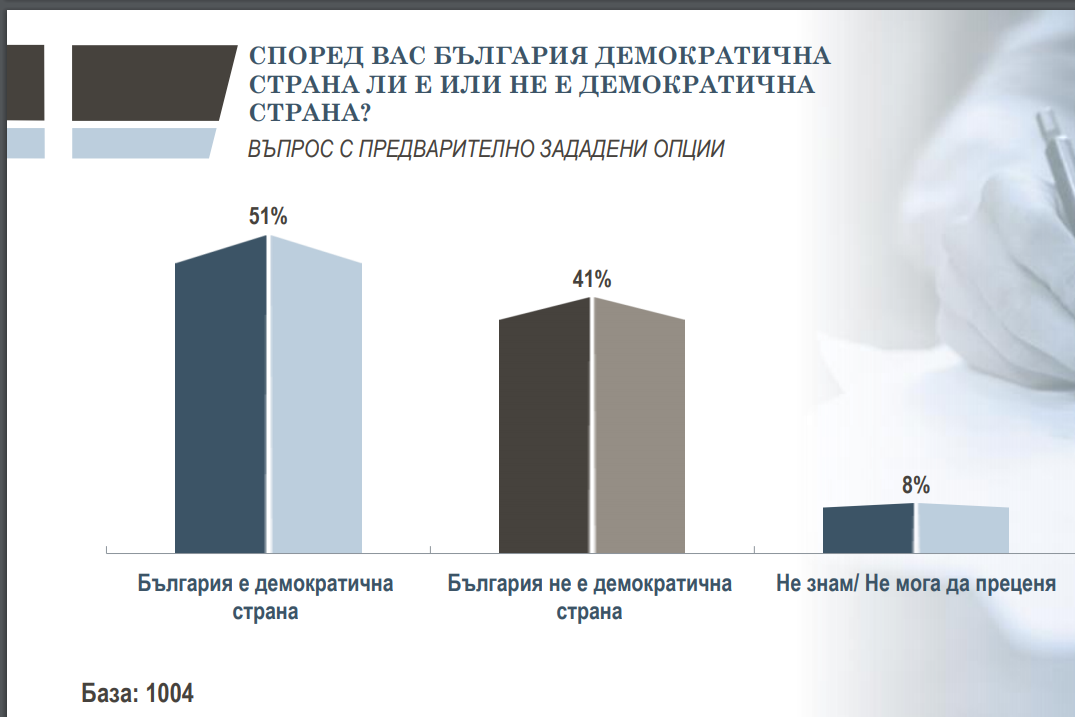 И тук се наблюдават различия по възраст и тип населено място. Най-младите и живеещите в столицата са по-убедени, че България е демократична страна спрямо общата картина, докато в селата например преобладава мнението, че България не е демократична страна.
