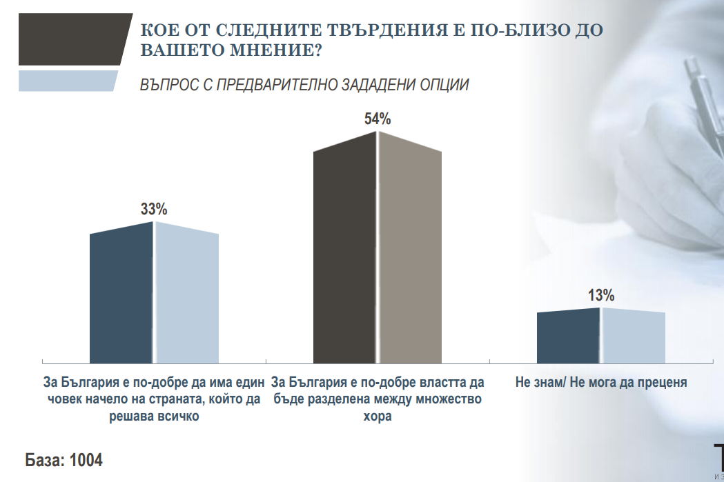 Малко повече от половината - 54% от анкетираните смятат, че е по-добре властта да бъде разпределена между множество хора. Всеки трети българин обаче иска авторитарно управление - един човек да стои начело на страната и да взема всички решения. Още 13 на сто не могат да решат. Т. е въпреки че позициите на хората, които искат разделение на властите изглежда преобладаваща, това е доста крехко мнозинство, поне според данните..