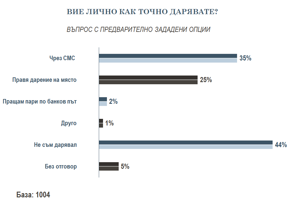 Българите не могат да се определят като много въодушевени дарители, поне според отговорите им от изследването. Преобладаващото мнозинство - над 54 на сто, отговарят, че не са правили дарение през последната година. Предпочитаният начин си остава изпращането на SMS - за 35 на сто от анкетираните.