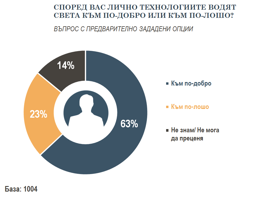 Стабилно мнозинство от българите вярва, че технологиите водят света към по-добро. Неверниците в прогреса са 23 на сто. Сред най-младите само една десета смятат, че технологиите водят светът към по-лошо, докато при хората над 60 години процентът нараства до над една трета.