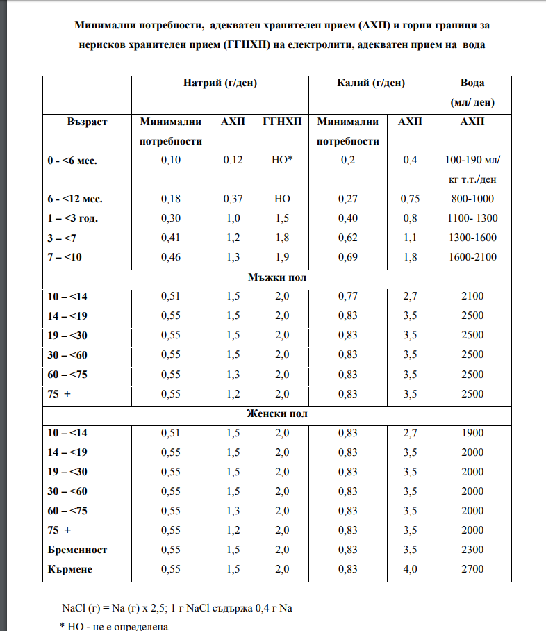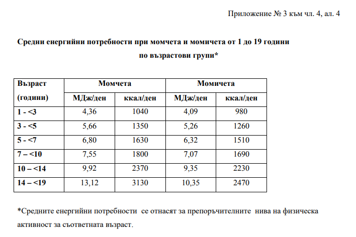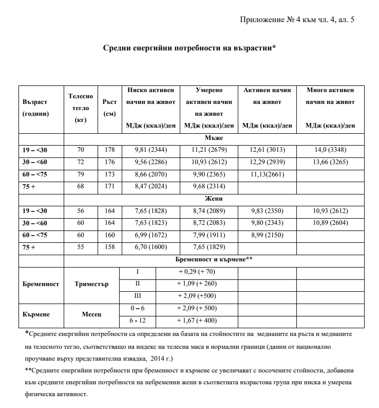 Актуализиран е и приемът на витамините, минералните вещества, стойностите за адекватен прием на калий и вода, въведени са стойности за минимални потребности от натрий и калий; стойностите за горни граници за нерисков прием на витамин D и флуор; препоръчителните интервали за прием на общ белтък, общи мазнини, мастни киселини, общи въглехидрати, диференцирани по възраст. Приложени са специални таблици, които указват какъв да бъде приемът на калории за всяка възрастова група, както и колко белтъци, въглехидрати, мазнини и т.н. трябва да поемате в зависимост от това на колко сте години.