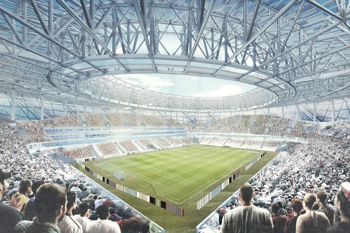 Още една виртуална илюстрация. Стадионът (за 44 899 зрители) трябваше да бъде завършен в края на тази година, но това ще стане в началото на следващата. Възникнаха проблеми при строителството, а през октомври горя и пожар (долу).