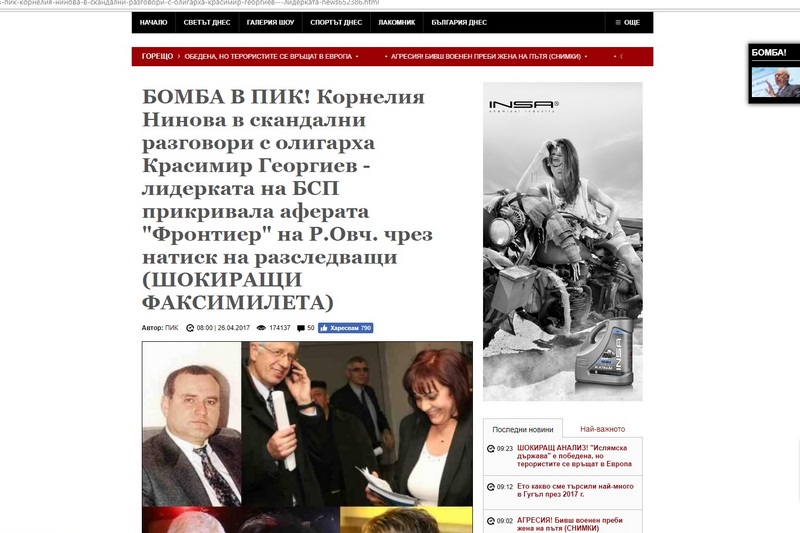 Заглавието на статията е "БОМБА В ПИК! Корнелия Нинова в скандални разговори с олигарха Красимир Георгиев - лидерката на БСП прикривала аферата "Фронтиер" на Р. Овч. чрез натиск на разследващи (ШОКИРАЩИ ФАКСИМИЛЕТА)".