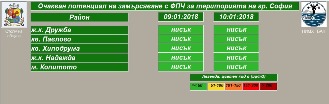 И днес София осъмна като в мъгла, въпреки че системата за ранно предупреждение за надвишаване на нормите на фини прахови частици (ФПЧ), разработена от БАН по поръчка на Столичната община, показва, че на 9 януари всичко ще е наред. Според прогнозата така ще е и утре. В същото време кметът Йорданка Фандъкова призна: